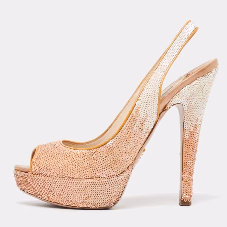 Pre Owned صندل برادا زهري/أبيض ترتر مقدمة مفتوحة نعل سميك حزام خلفي مقاس 36.5