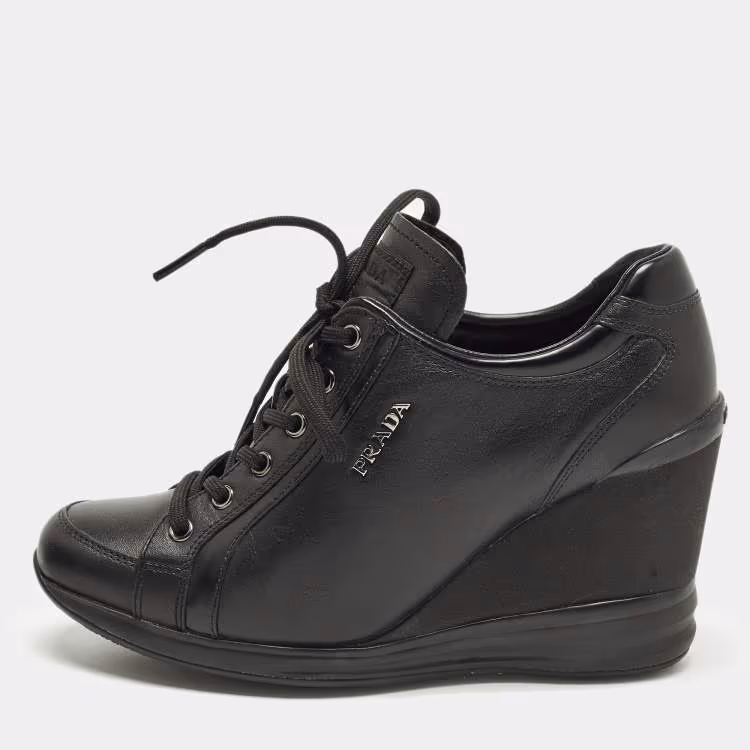 Pre Owned حذاء رياضي برادا إسفين جلد أسود مقاس 37