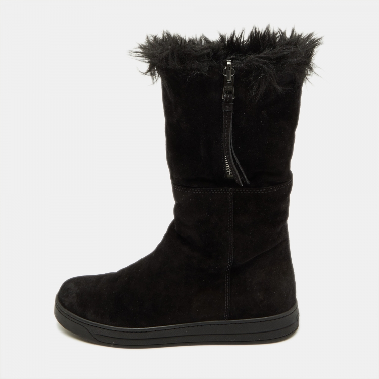 مملوكة مسبقًا حذاء بوت برادا سبورت بطول الكاحل تقليم فرو صناعي وسويدي أسود مقاس 38
