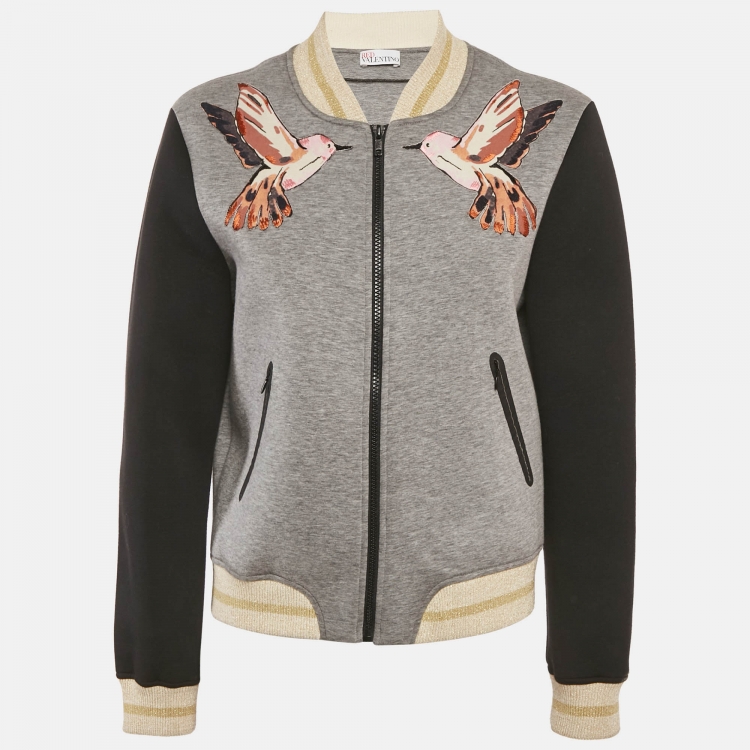جاكيت فالنتينو رمادي بزخرفة طيور من النيوبرين مقاس كبير - لارج