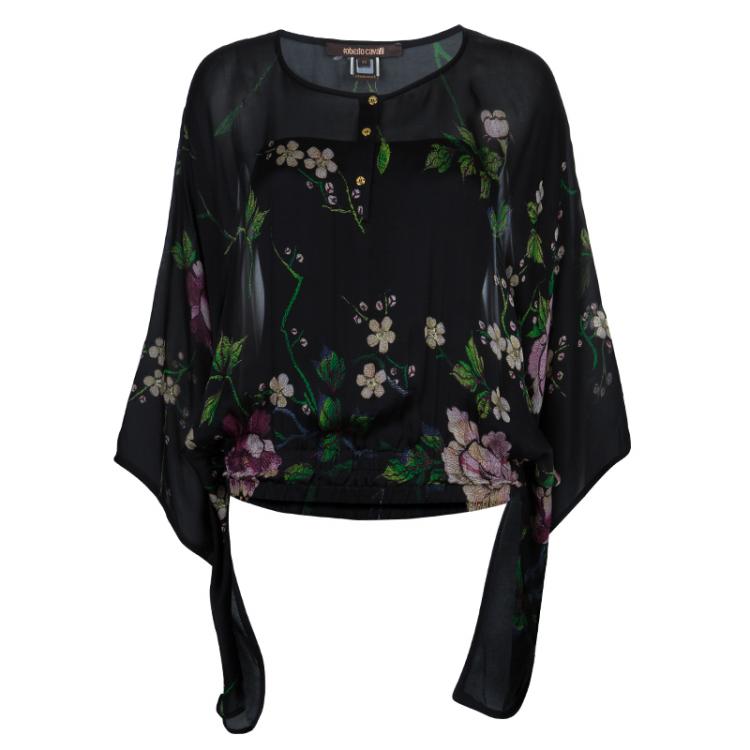 بلوزة روبرتو كافالي سوداء طباعة موردة كم فضفاض شفافة M