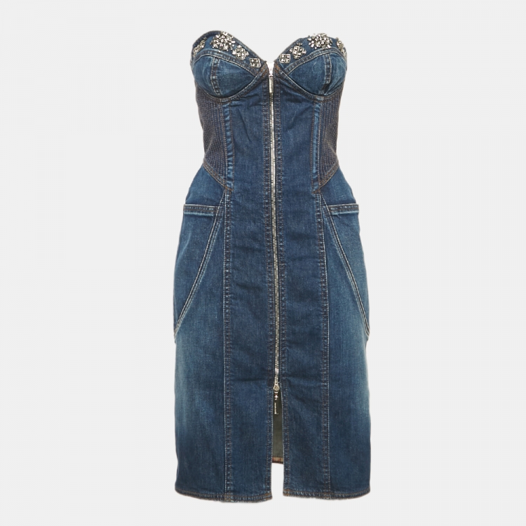 فستان روبرتو كافالي جينز مزين بصديرية أزرق قصير مقاس وسط (ميديوم)