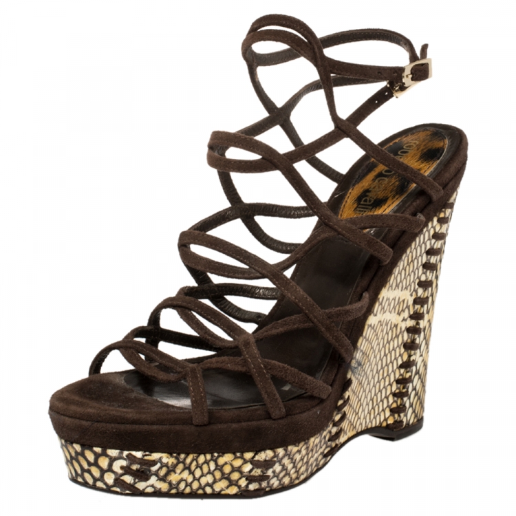 مملوكة مسبقًا صندل روبرتو كافالي سيور كعب روكي جلد ثعبان و سويدي بني مقاس 38.5