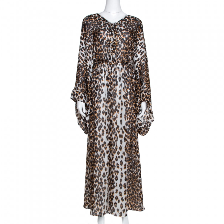 فستان ماكسي روبرتو كافالي حرير بني وأبيض نقشة الفهد مقاس متوسط (ميديوم)