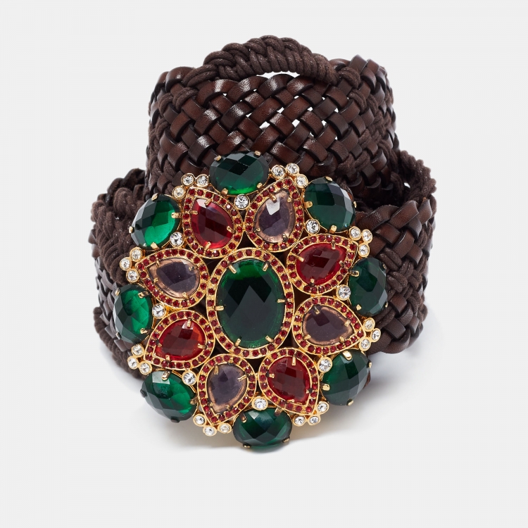 مملوكة مسبقًا حزام روبرتو كافالي جلد مجدول بني داكن مزخرف كريستال
