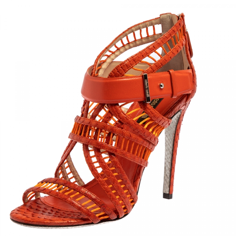 مملوكة مسبقًا صندل روبرتو كافالي جلد ثعبان وجلد برتقالي قفصي مقاس 40