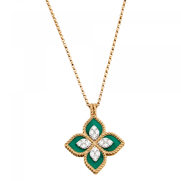 Pre Owned Roberto Coin Princess Flower Malachite Diamond 18k Rose Gold Pendant Necklace