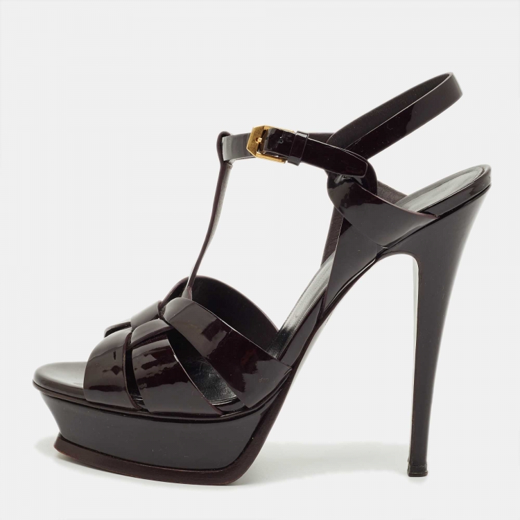 مملوكة مسبقًا صندل إيف سان لوران جلد عنابي لامع نعل سميك مقاس 39