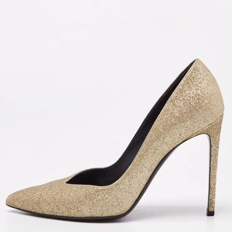 حذاء كعب عالي سان لوران ذهبي لامع بمقدمة مدببة مقاس 40