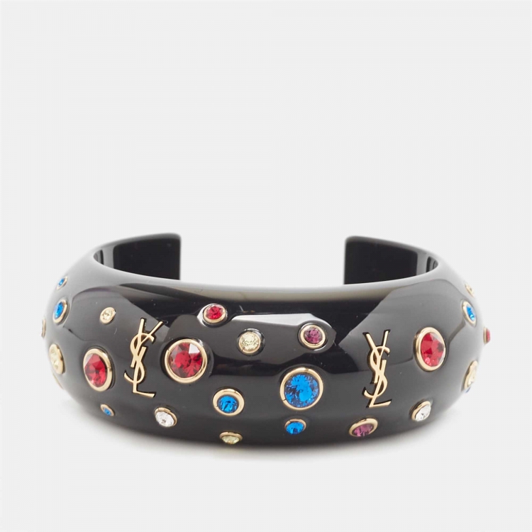 Saint Laurent Black Crystal Embellished Gold Tone Open Cuff Bracelet