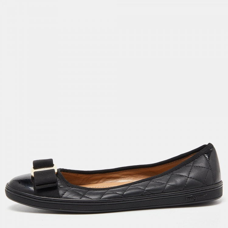 Salvatore Ferragamo Black Quilted Leather and Patent Varina Ballet Flats Size 35.5