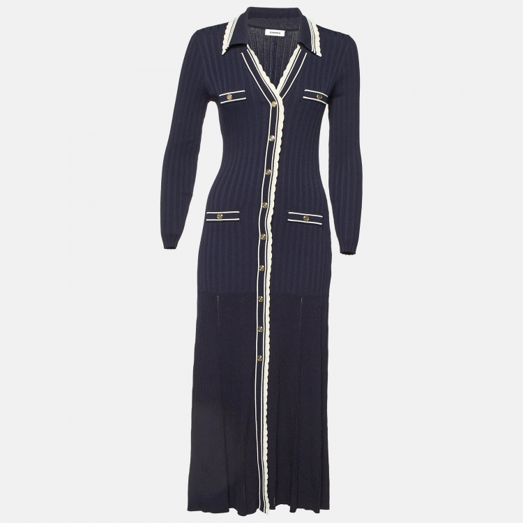 مملوكة مسبقًا Sandro Navy Blue Rib Knit Crochet Lace Trimmed Midi Dress M