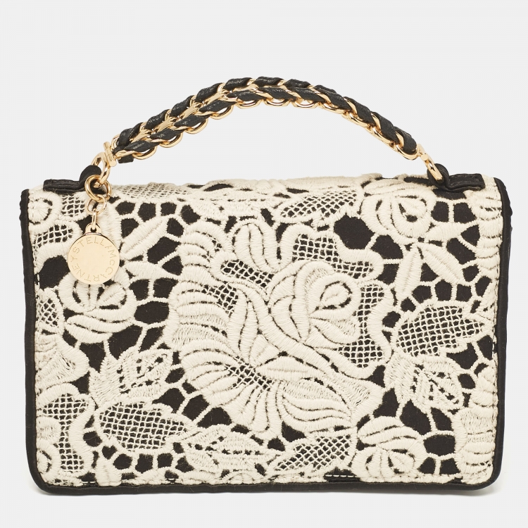 Stella McCartney Black/White Satin Embroidered Top Handle Bag