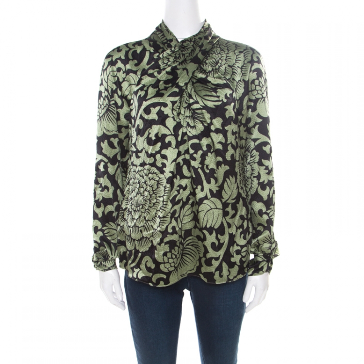 Pre Owned توب تمبرلي لندن حرير منقوش مورد مطبوع أسود وأخضر ملتف M