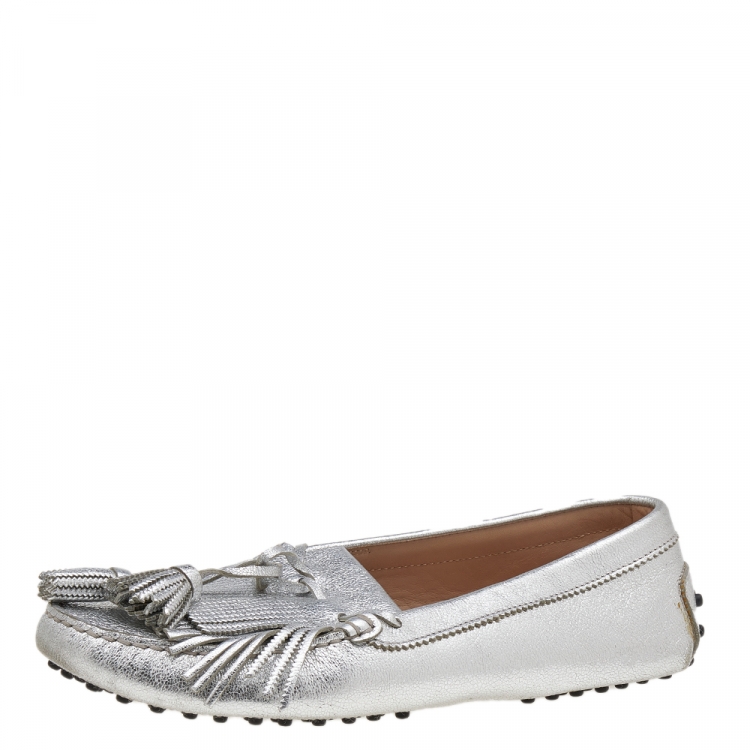 حذاء لوفرز تودز جلد فضي مزين فيونكة دلاية بشراشيب وشراشيب سليب أون مقاس 39