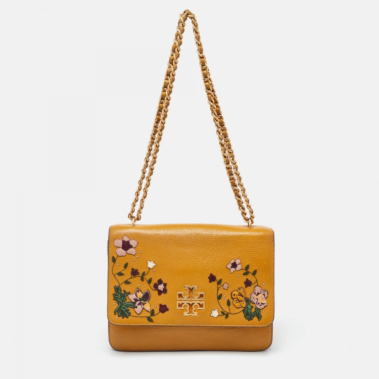 Tory Burch Mustard Leather Britten Floral Applique Flap Bag