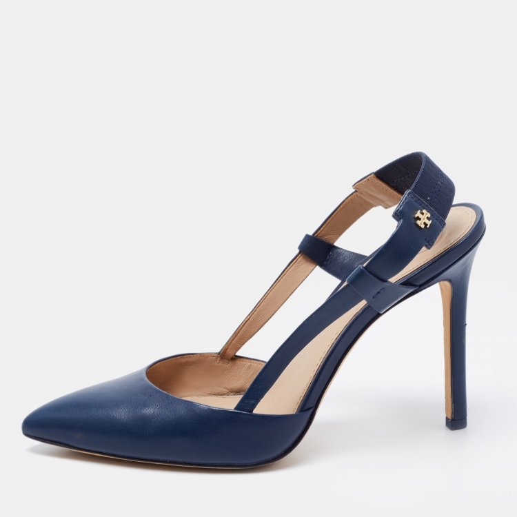 Pre Owned Tory Burch Navy Blue Leather Pointed Toe Slingback Pumps Size 37.5