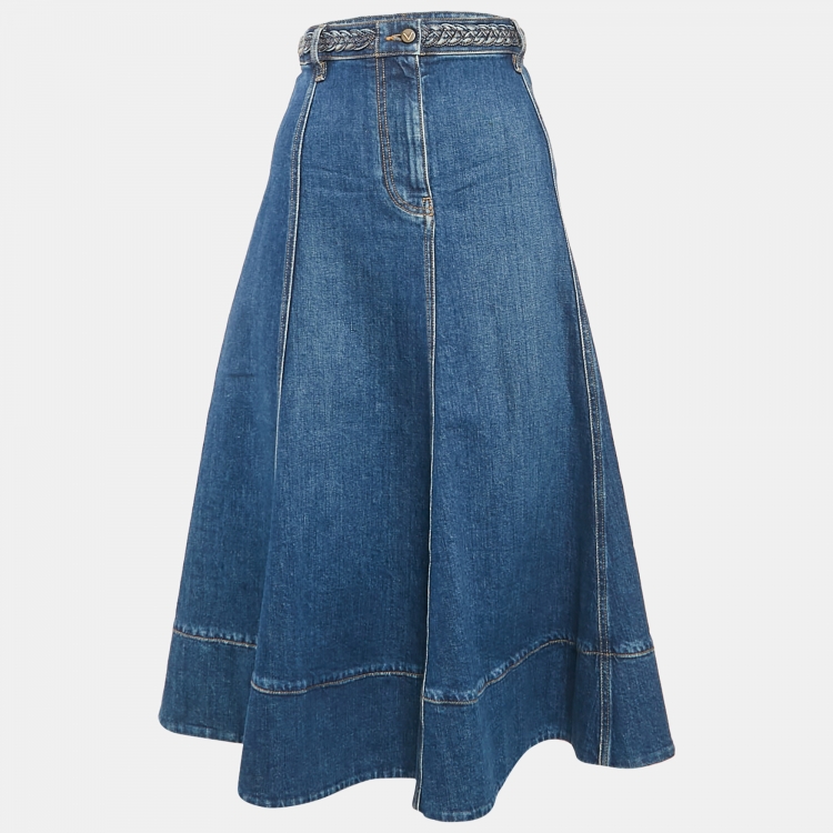 Pre Owned تنورة ميدي فالنتينو دنيم أزرق بتفاصيل ضفائر خصر مقاس صغير (سمول)