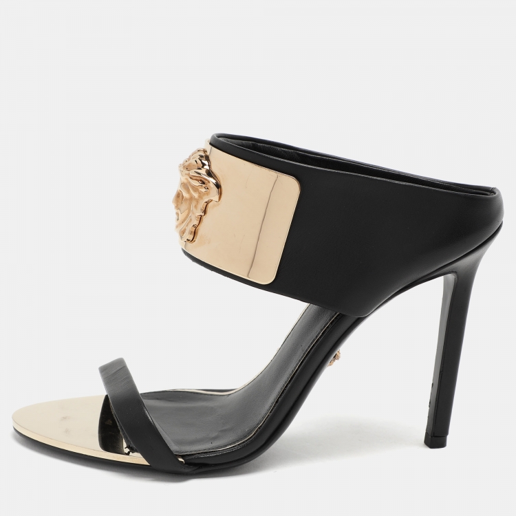 Pre Owned صندل سلايد فيرساتشي ميدوسا معدن وجلد ذهبي/أسود مقاس 37