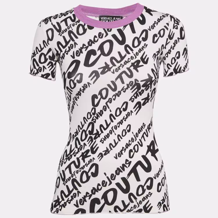 تي شيرت فيرساتشي جينز كوتور ياقة دائرية قطن بطبعة شعار فرشاة أبيض مقاس صغير جدًا