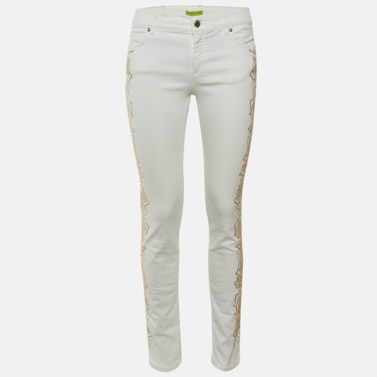 بنطلون جينز فيرساتشي جينز دنيم أبيض مرصع مقاس ميديم - متوسط