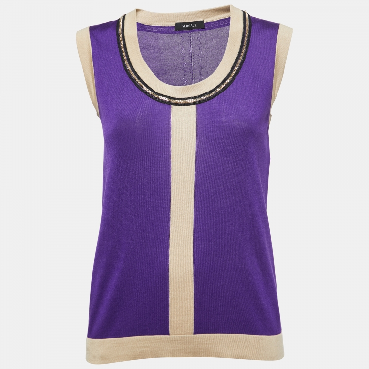 Pre Owned Versace Purple Silk Knit Contrast Trim Sleeveless Top L