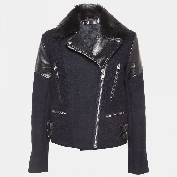 Pre Owned Victoria Beckham Navy Blue Fur and Leather Trim Wool Biker Jacket S