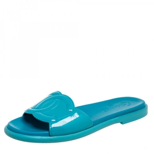 حذاء سلايدز شانيل فلات سى سى جلد لامع أزرق مقاس 39