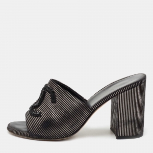 حذاء شانيل كانفاس مقلم أسود وأبيض كعب وتدي سلايدز مقاس 38