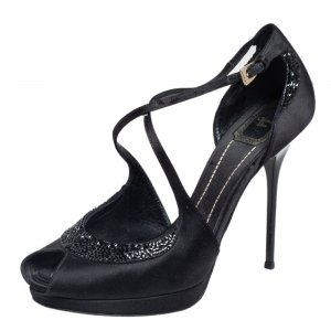 صندل ديور ساتان أسود بمقدمة مفتوحة بزخارف كريستال وحزام كاحل مقاس 39