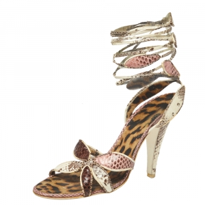 حذاء كعب عالي روبرتو كافالي جلد بيج ومقدمة جلد ثعبان بحزام للكاحل مقاس 38