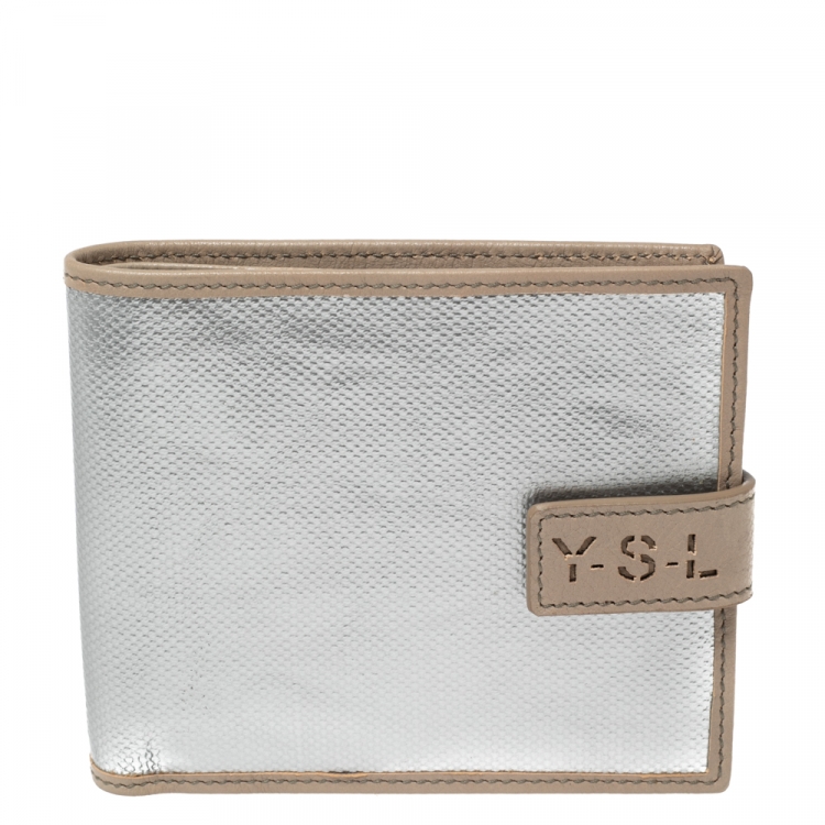 مملوكة مسبقًا محفظة إيف سان لوران جلد بيج/فضي ثنائية الطي