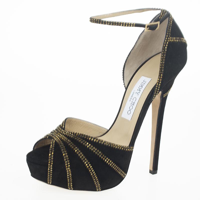 Take a look at the gorgeous Jimmy Choo Kalpa Sandals. Inspired by Art Deco, these super high platform sandals are created in black suede with gold crystallized detail.