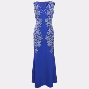 Tadashi Shoji Blue Floral Embroidery Textured Crepe Sleeveless Gown S