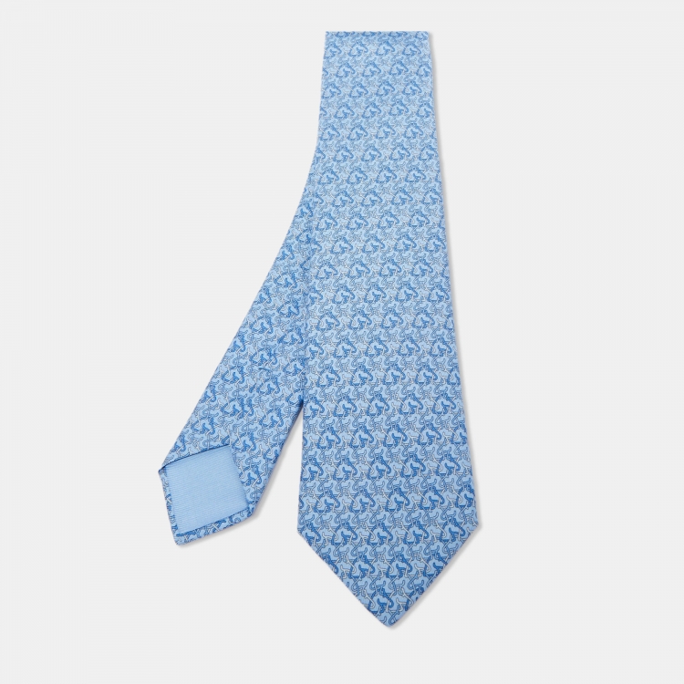 Hermès Blue 7 Chevalophile Printed Silk Slim Tie