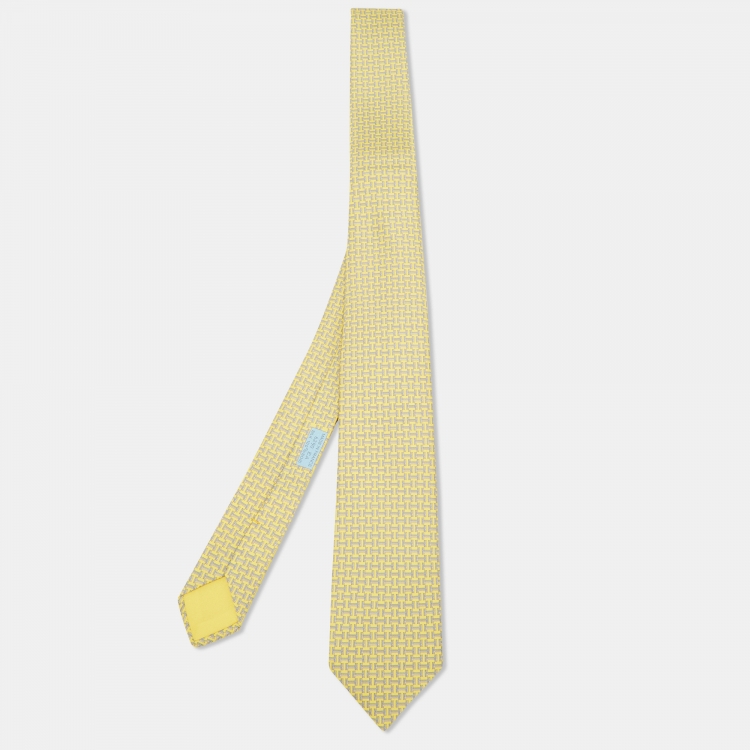 مملوكة مسبقًا Hermès Yellow 7 Quinte Printed Silk Slim Tie