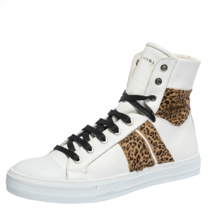 Amiri White/Brown Leather and Leopard Print Calfhair Sunset High Top Sneakers Size 42