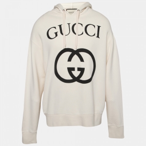 Gucci Cream Logo Printed Cotton Applique Detail Oversized Hoodie XL
