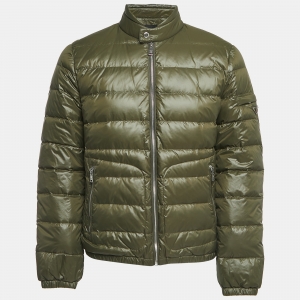 Prada Military Green Quilted Nylon Logo Patch Zip Front Down Jacket L