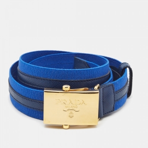 Prada Two Tone Blue Elastic Fabric and Saffiano Leather Buckle Belt Size 85CM