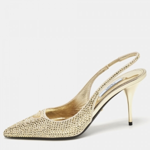 Prada Gold Satin Crystal Embellished Triangle Logo Slingback Pumps Size 36
