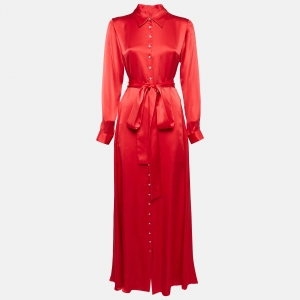 Semsem Red Satin Silk Button Front Belted Maxi Dress S
