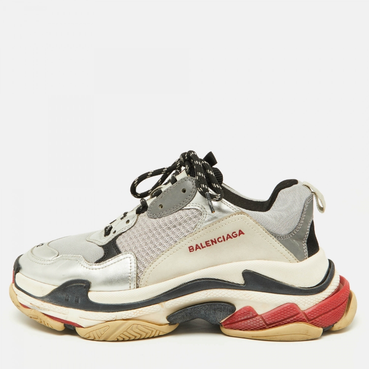 Pre Owned Balenciaga Silver Mesh and Faux Leather Triple S Lace Up Sneakers Size 42