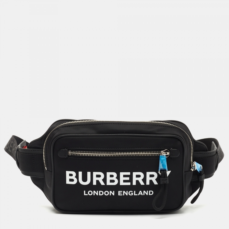 حقيبة خصر بربري بام نايلون مطبوع بشعار الماركة وجلد سوداء