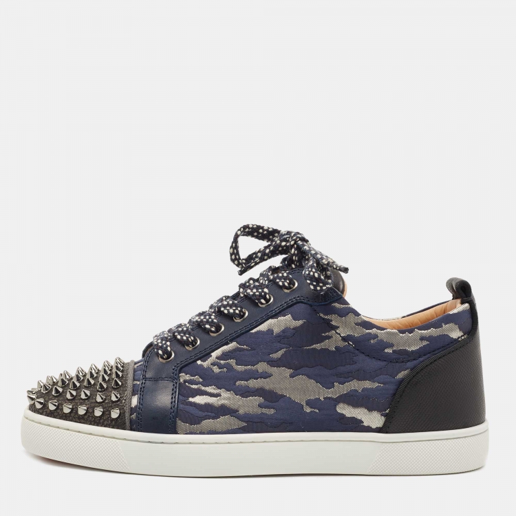 Christian Louboutin Black/Blue Leather and Lurex Fabric Louis Junior Spikes Low Top Sneakers Size 39.5