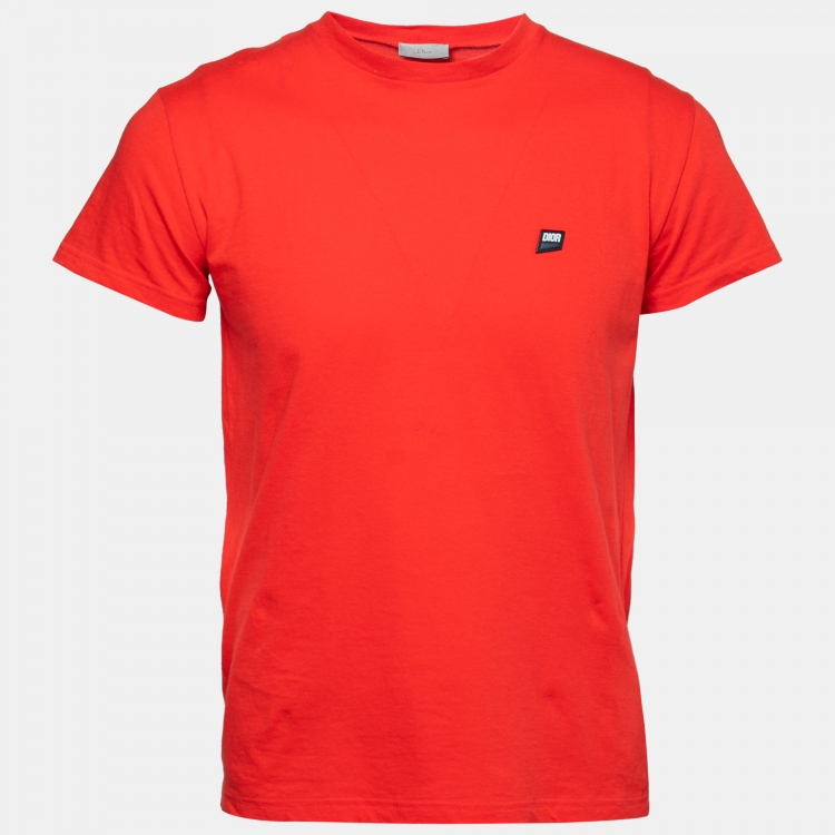 مملوكة مسبقًا تي شيرت ديور هوم قطن أحمر بالشعار الأبليك أكمام قصيرة مقاس صغير - سمول