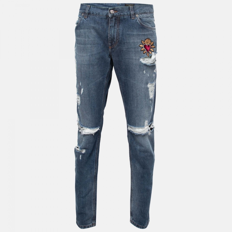 Pre Owned Dolce & Gabbana Blue Ripped Heart Embroidered Denim Jeans 2XL Waist 37"