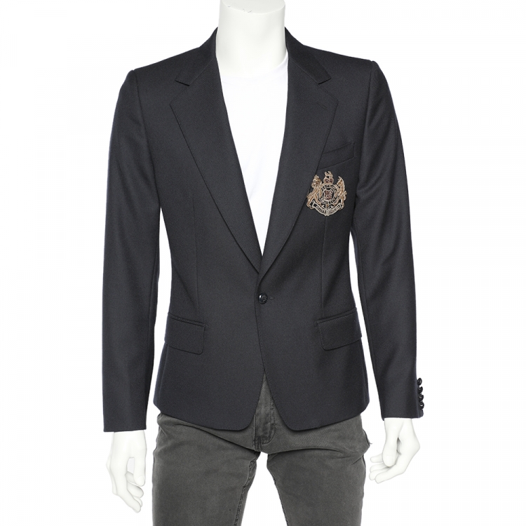 جاكيت بليزر دولتشي أند غابانا صوف أزرق داكن صدرية واحدة مطرز شعار الماركة مقاس وسط (ميديوم)