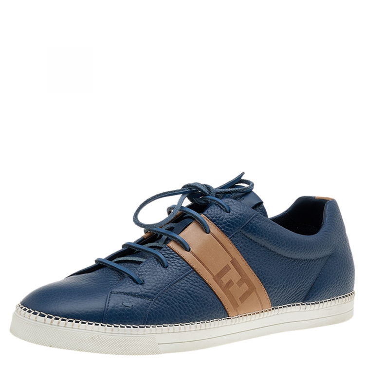 حذاء رياضي فندي عنق منخفض شريط شعار أف أف جلد بني /أزرق مقاس 44