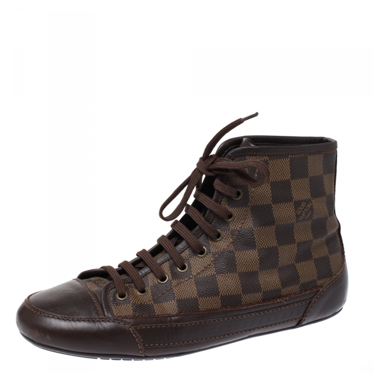 حذاء رياضي لوي فيتون مرتفع من أعلى أربطة جلد بني وكانفاس دامييه أيبين مقاس 40